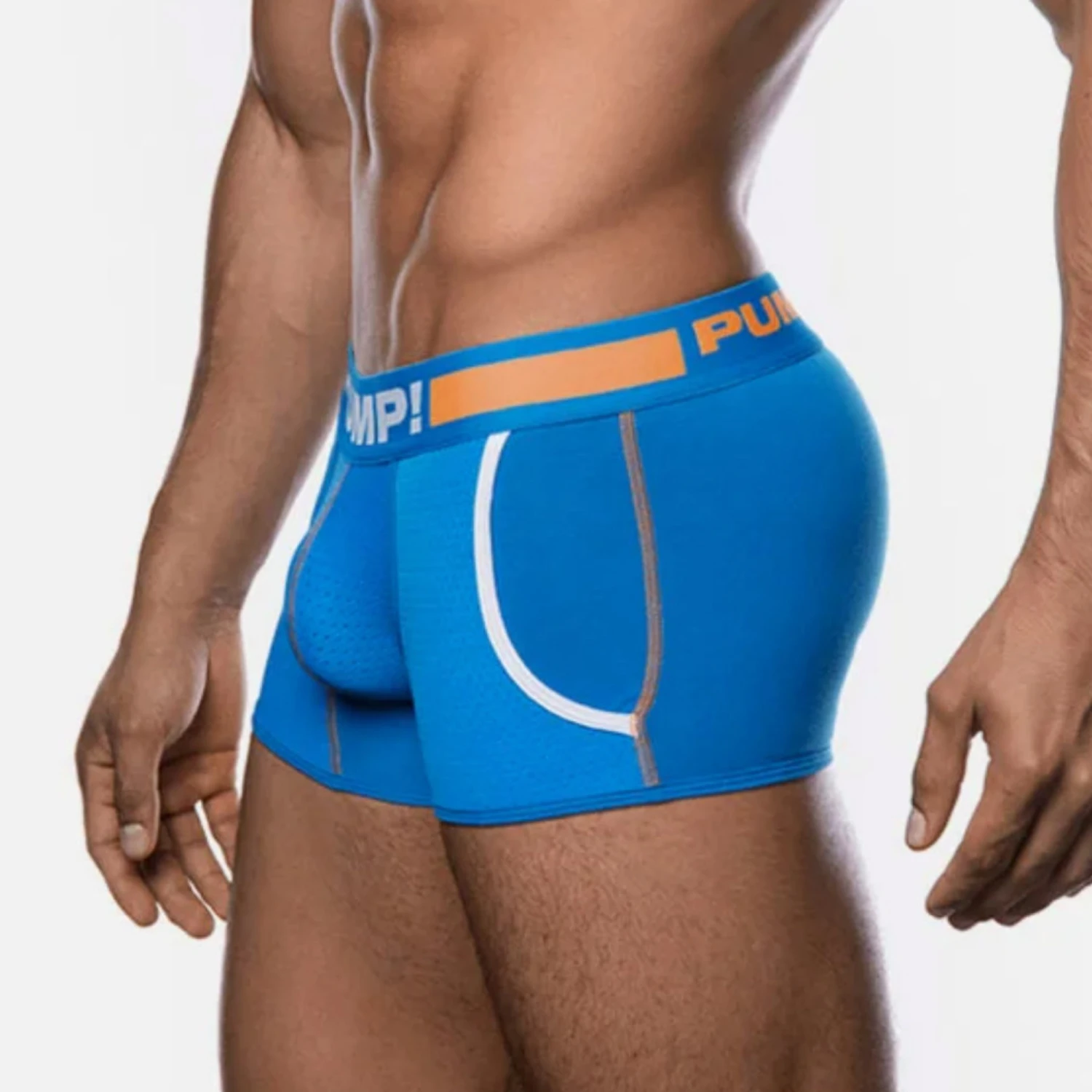 Underwear with pockets! Add color to your look with PUMP!’s Cruise Jogger Trunk. Its blue cotton body has two mesh pockets that will fit your keys—handy while at a party. It features a mesh cup with neon orange stitching, a blue, neon orange and a comfortable white 5mm elastic waistband.