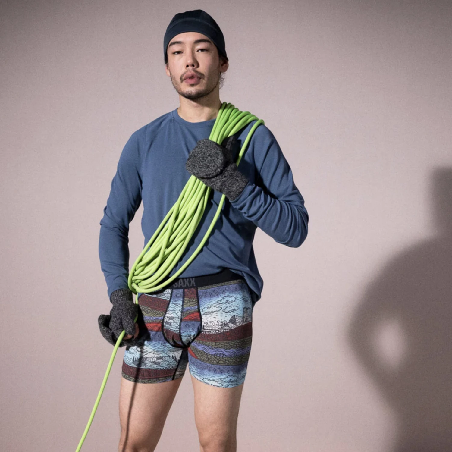 This SAXX Boxer Brief is for the guy who’s going places. Fabricated using a quick-dry mesh, Quest holds its own on any outdoor adventure, while still delivering the comfort required for all-day wear. Elements is designed by featured artist, Daniel McCoy Jr. With the intent to leave an imprint, Daniel recreates past triumphs, current disasters, and inspiring stories in his paintings. Currently living in Santa Fe, NM, Daniel’s work is influenced by counterculture cartooning, traditional New Mexican landscape painters, quilts, block-style printmaking, and hiking with his family.